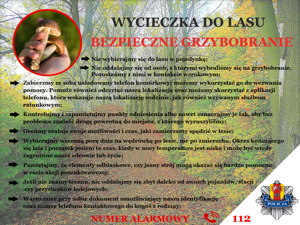 Rozpoczął się sezon na grzybobranie. Dla wielu to sposób na aktywny odpoczynek i hobby, jednak wybierając się do lasu zawsze powinniśmy pamiętać o swoim bezpieczeństwie. Warto powiadomić bliskich, gdzie idziemy i kiedy zamierzamy wrócić. Zawsze zabierajmy ze sobą telefon komórkowy z naładowaną baterią. Jeśli podejrzewamy, że ktoś z naszych bliskich zgubił się w lesie natychmiast zaalarmujmy policjantów.