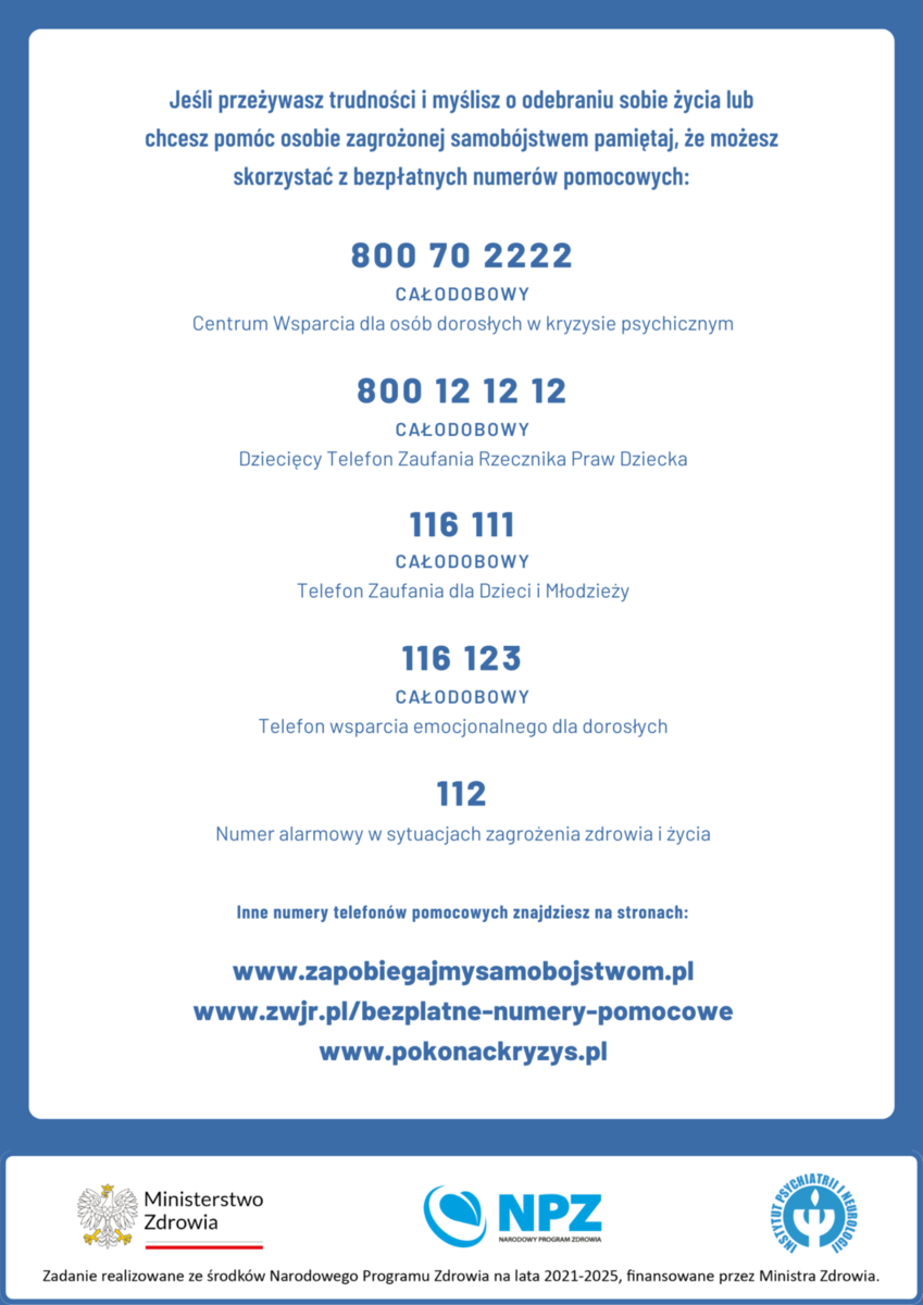 - Krajowy Telefon Zaufania dla Osób Dorosłych w Kryzysie Emocjonalnym: 116 123