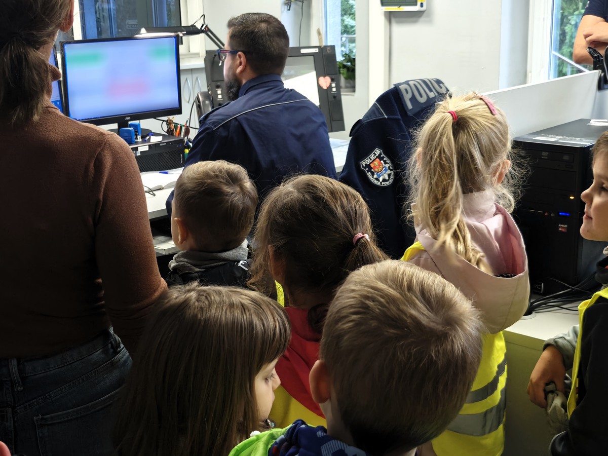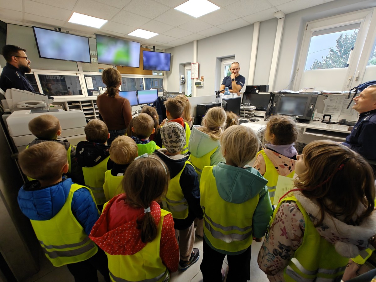 Następnie dzieci zwiedziły pomieszczenia, w których przebywają osoby zatrzymane, czyli miejsca przeznaczone dla osób podejrzanych o popełnienie przestępstw. To właśnie tam funkcjonariusze zaprezentowali wykrywacz metali wykorzystywany podczas sprawdzeń osób. Kolejnym punktem wizyty było stanowisko kierowania, gdzie przedszkolaki mogły zobaczyć, jak działa system miejskiego monitoringu i „okiem kamery” spojrzeć na swoje miasto. Dyżurni opowiedzieli najmłodszym o swojej odpowiedzialnej pracy, o tym, jak z poziomu stanowiska kierowania nadzorują działania podległych patroli oraz koordynują interwencje.