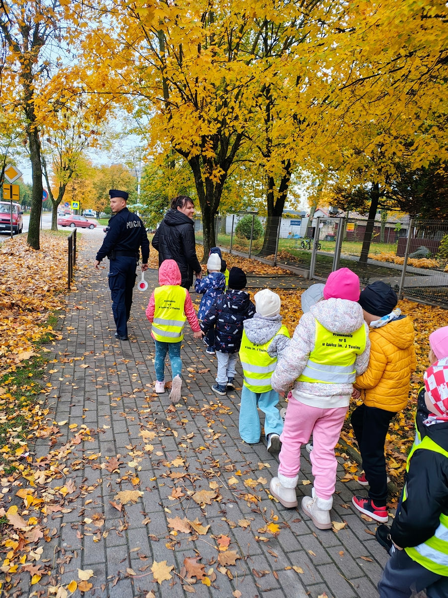 Po części teoretycznej przyszedł czas na praktykę. Profilaktycy wraz z grupą przedszkolaków udali się na spacer, podczas którego najmłodsi ćwiczyli bezpieczne przechodzenie przez drogę i utrwalali wiedzę o konieczności bycia widocznym dla kierowców.