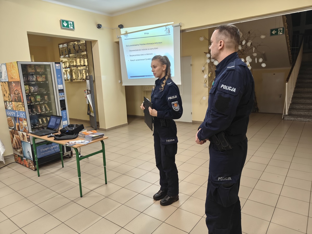 W ramach działań profilaktycznych pod nazwą "Świadomy Rodzic", 17 grudnia 2025 roku odbyło się spotkanie, podczas którego policjanci omówili sytuacje, w których nieletni mogą ponieść konsekwencje prawne swoich czynów oraz wskazali, jaką rolę w tym zakresie odgrywają rodzice i opiekunowie. Funkcjonariusze przedstawili również zagrożenia wynikające z korzystania z internetu, zwracając uwagę na cyberprzemoc, kontakt z osobami nieznajomymi oraz niekontrolowane udostępnianie zdjęć i nagrań. Podczas rozmowy poruszono także temat ochrony wizerunku oraz odpowiedzialności związanej z nagrywaniem i publikowaniem materiałów z udziałem innych osób. Rodzice mieli możliwość zadawania pytań i uzyskania odpowiedzi dotyczących nurtujących ich kwestii.