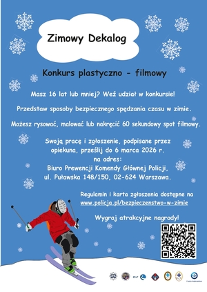 Zachęcamy wszystkich do wzięcia udziału w konkursie plastyczno-filmowym na zilustrowanie bezpiecznych zachowań w tym rekreacji i aktywności fizycznej podczas całego sezonu zimowego pod nazwą „Zimowy Dekalog”. Konkurs adresowany jest do dzieci i młodzieży. Organizatorem konkursu jest Biuro Prewencji Komendy Głównej Policji wspólnie z Partnerami.