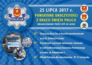Komendant Powiatowy Policji w Łasku, władze miasta oraz powiatu łaskiego serdecznie zapraszają mieszkańców powiatu na uroczyste obchody Święta Policji oraz "Piknik z Policją" pod hasłem "Kręci nas bezpieczeństwo".